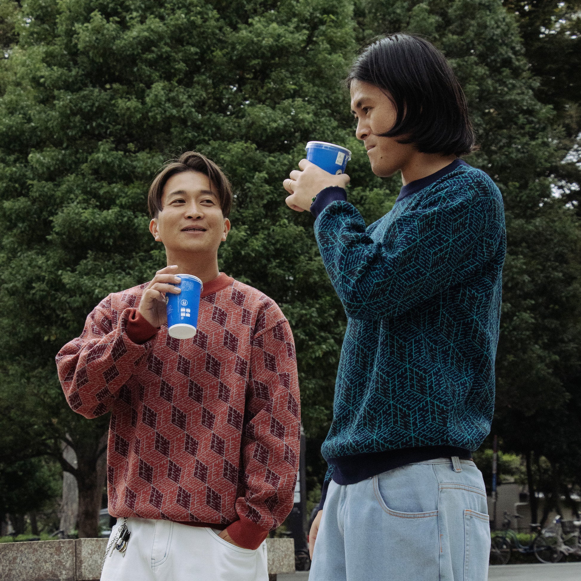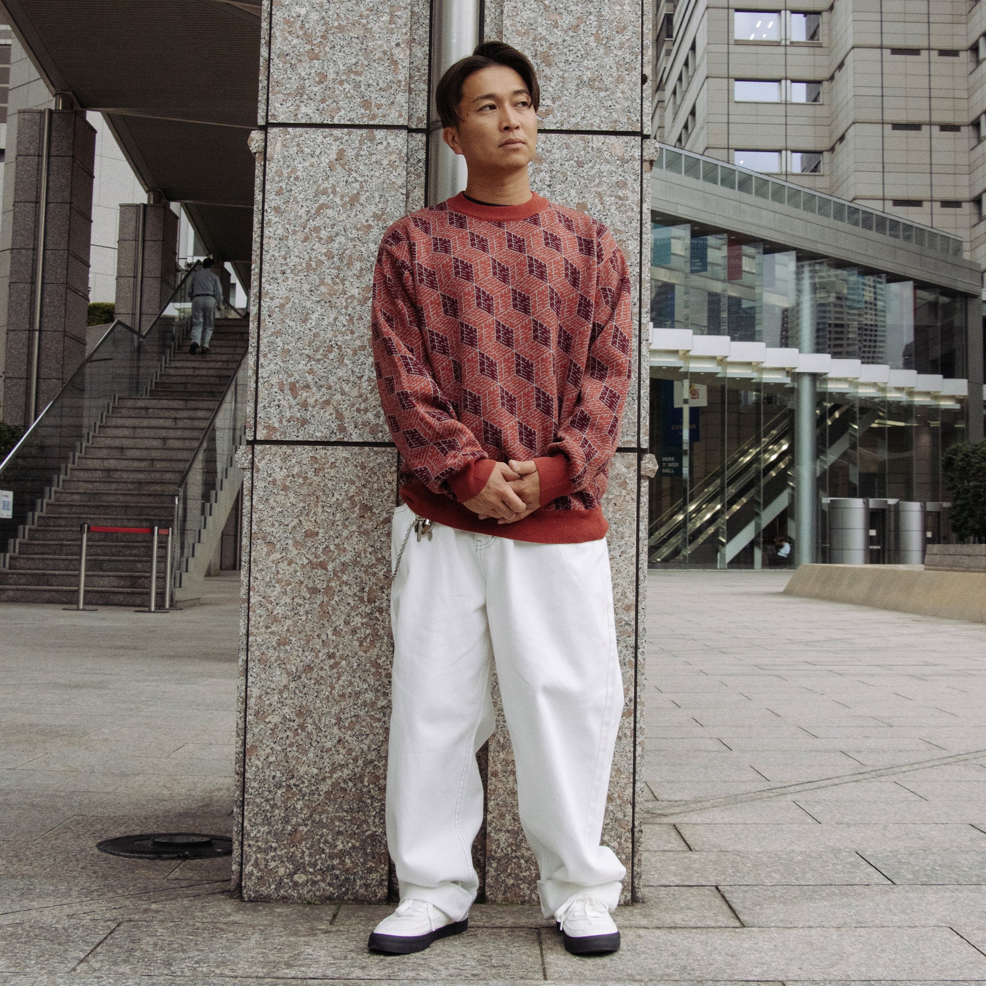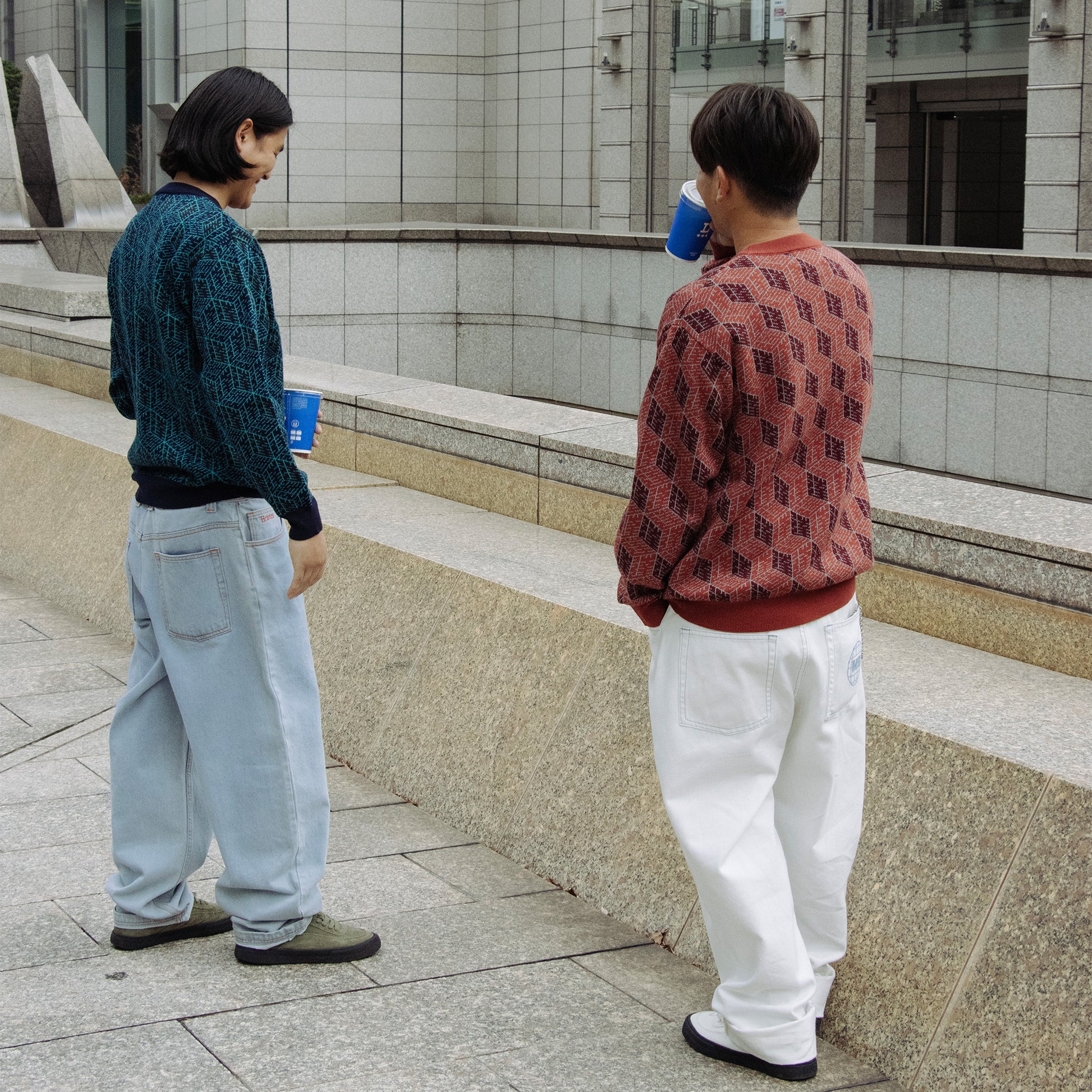 This original knit sweater features DARUMA STREET’s diamond logo, reimagined into a cube-shaped all-over pattern.