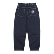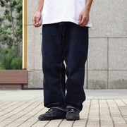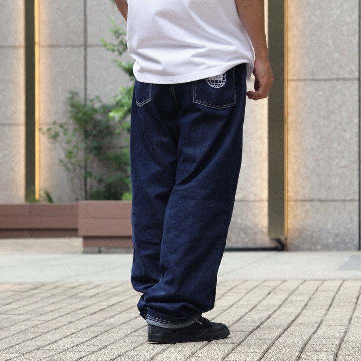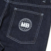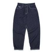 Big baggy fit denim with custom button, woven labels on back and inside, re-enforced stitching on crotch, double stitched on cuffs, and embroidered "Heavies" and "MOTO-BUNKA" collaboration logo on change pocket, MOTO-BUNKA icon logo is greatly embroidered on the back pocket. 100% original denim that you are finding.