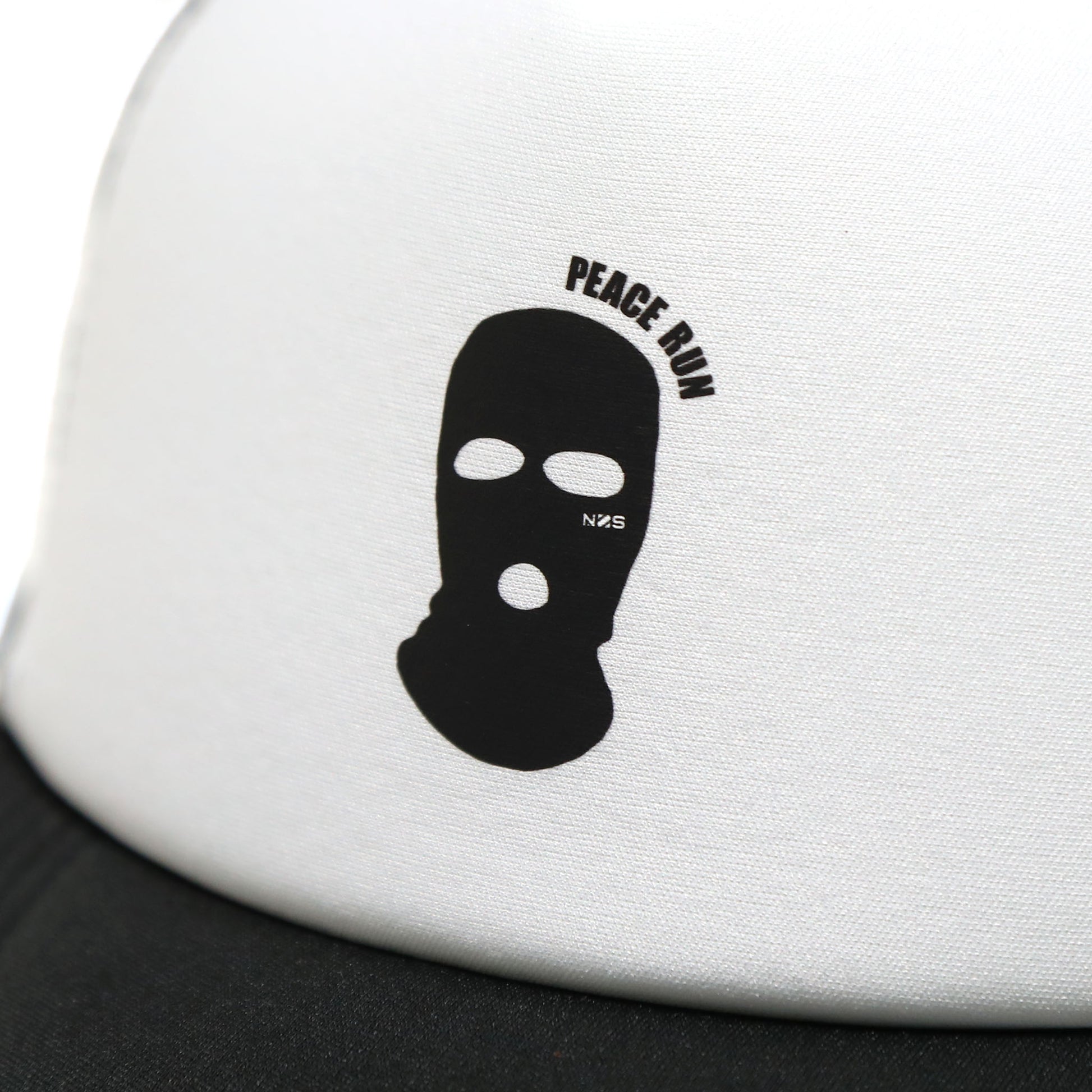A mesh cap featuring a balaclava graphic and the words "PEACE RUN" printed on the front.