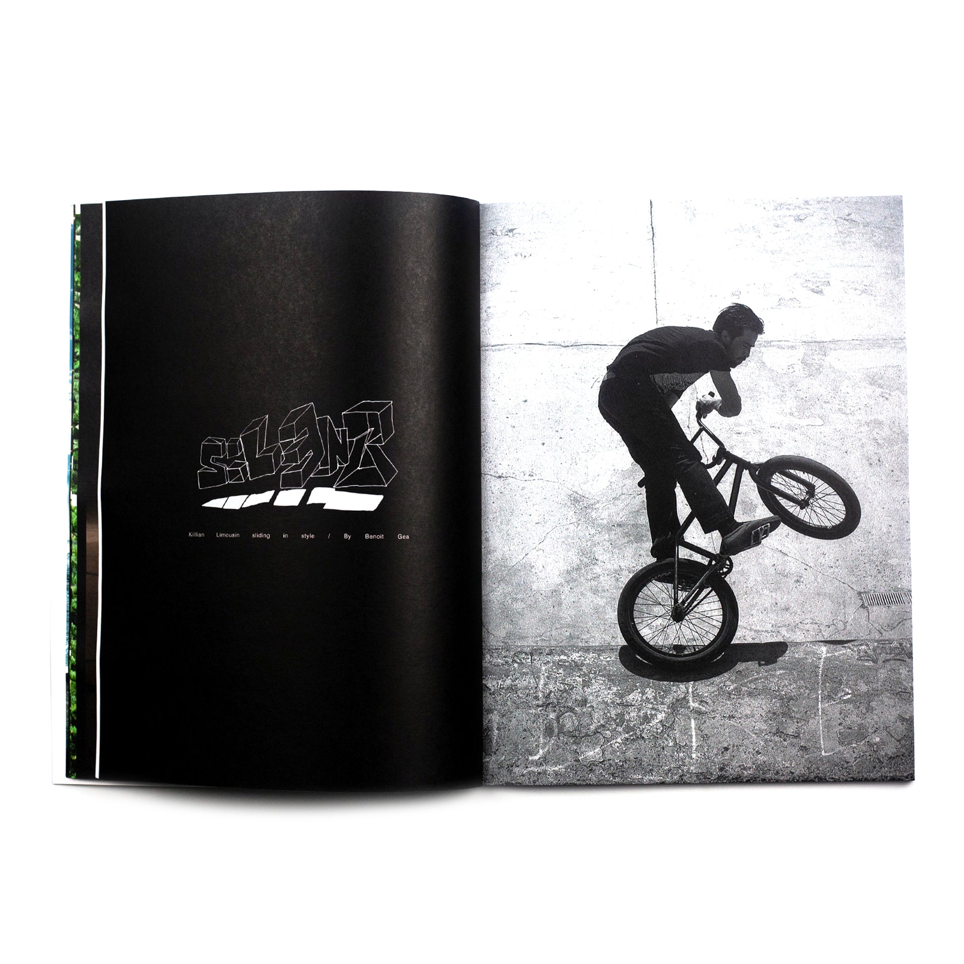 本誌は、タイトルであるSilent(静けさ)のコンセプトを徹底的に貫いているところも魅力のひとつです。誌面にはインタビューなどのテキストや企業広告は掲載されていません。本誌は、写真、イラスト、グラフィックなど様々なアーティストのクリエイティブを融合させ、BMXの魅力を最大限に引き出すことを目指しています。