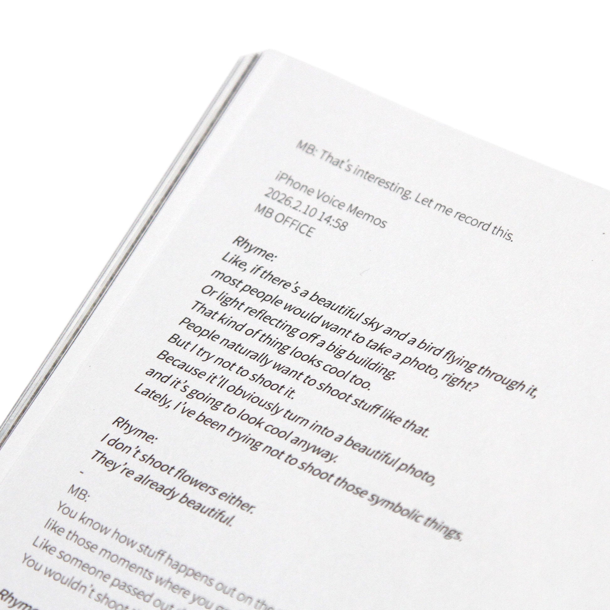 This book includes a selection of photographs shaped by his sharp perspective, along with a transcribed interview recorded on his iPhone voice memos.