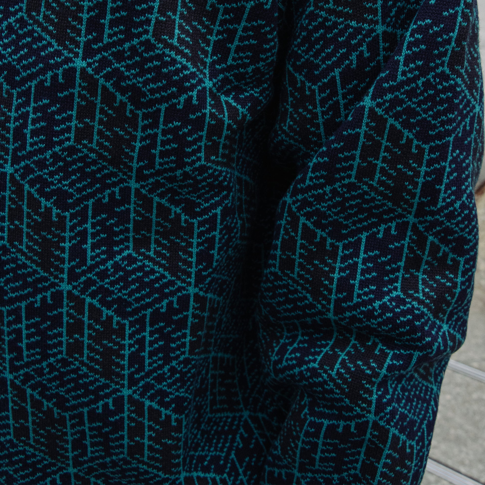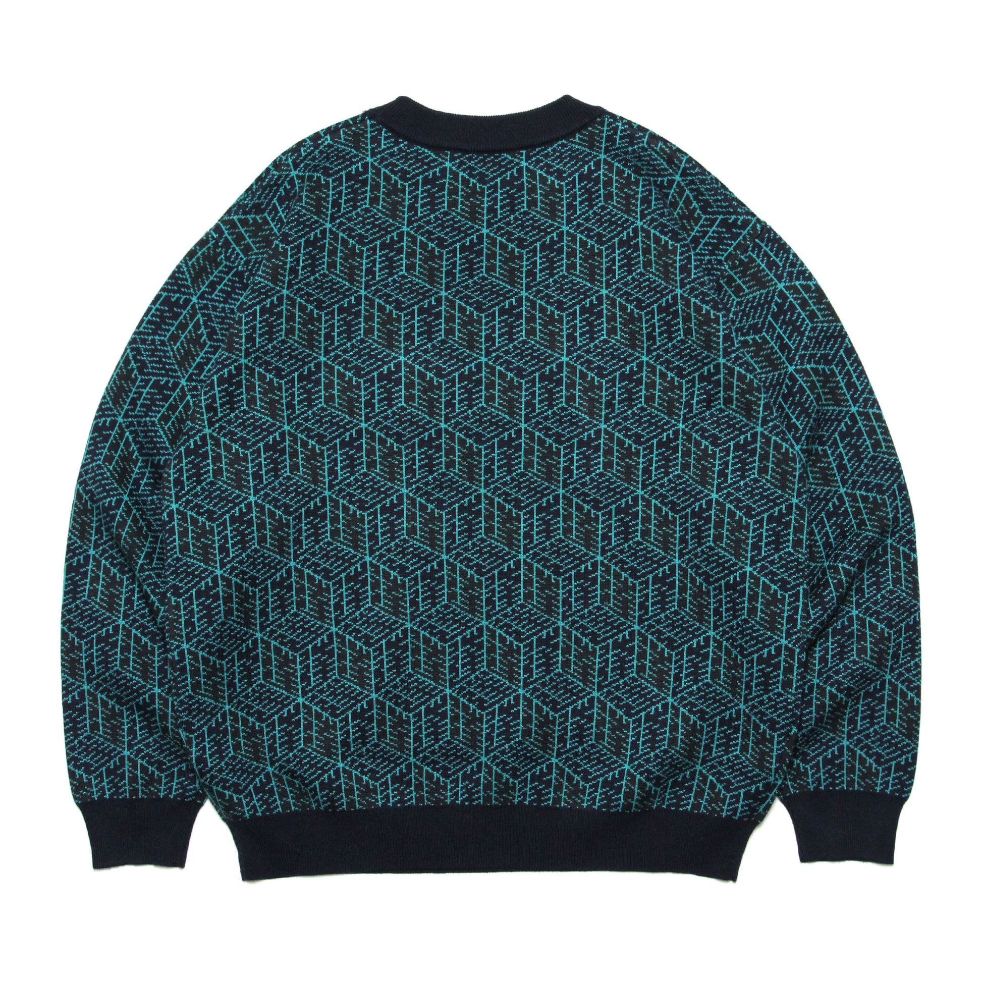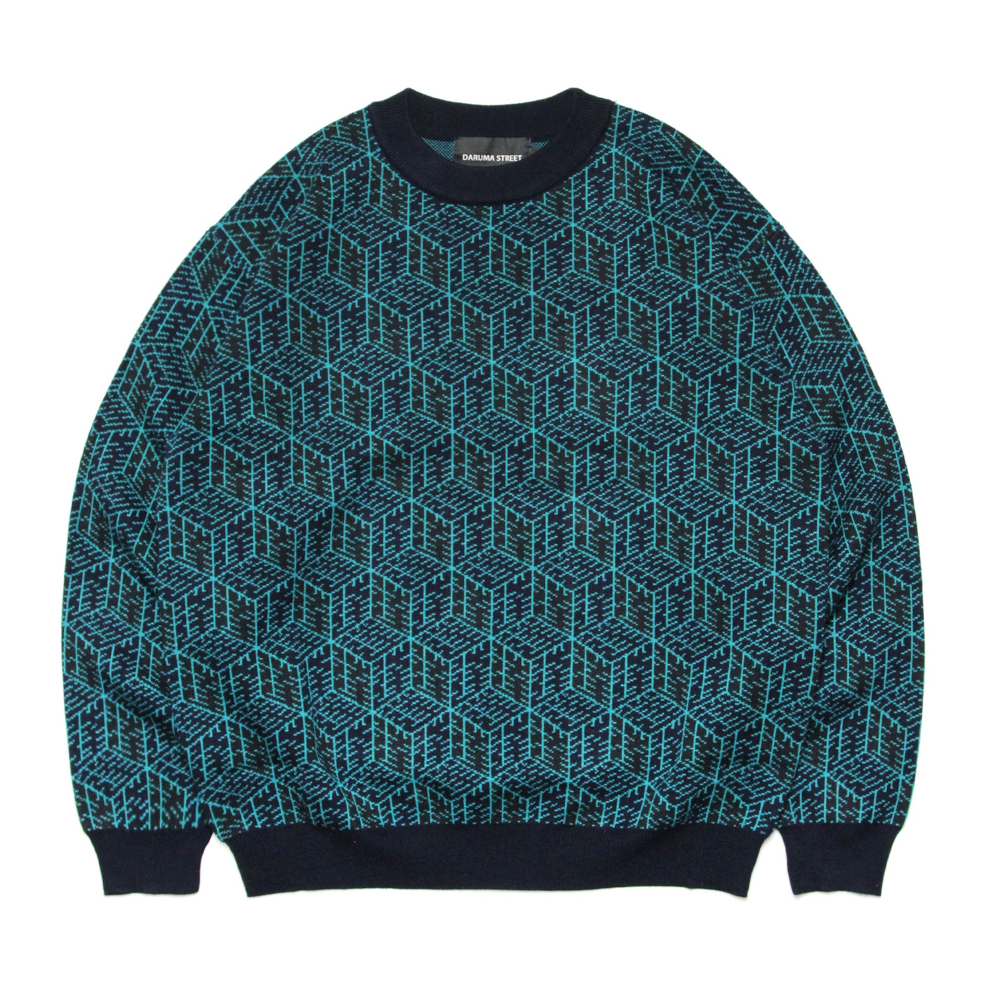 DARUMA STREET의 마름모 로고를 큐브 형태로 재해석하여 전체적으로 배치한 오리지널 니트 스웨터입니다.
