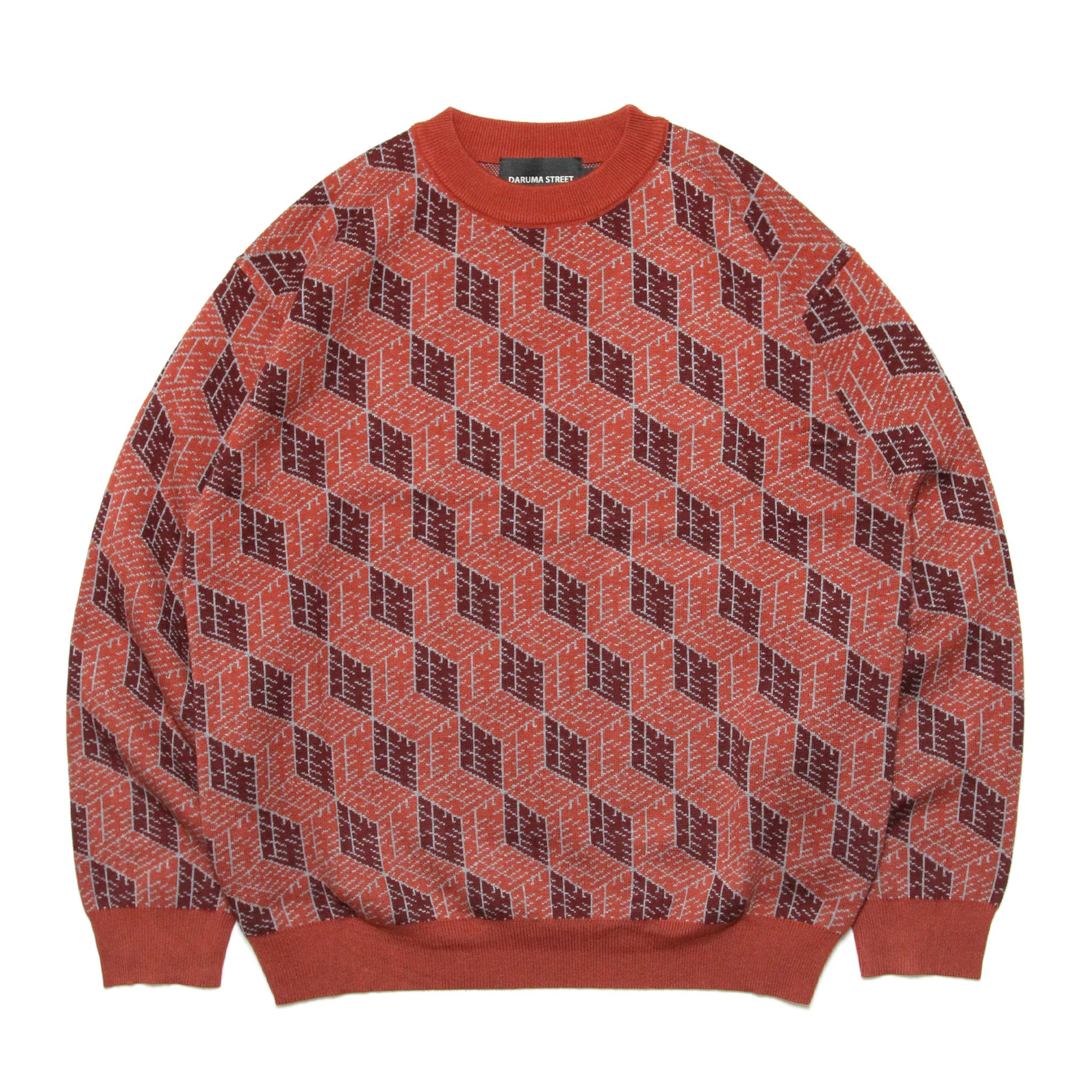 以 DARUMA STREET 菱形標誌為主題,重新設計成立體方塊圖案,整體佈滿於衣身的原創針織毛衣。
