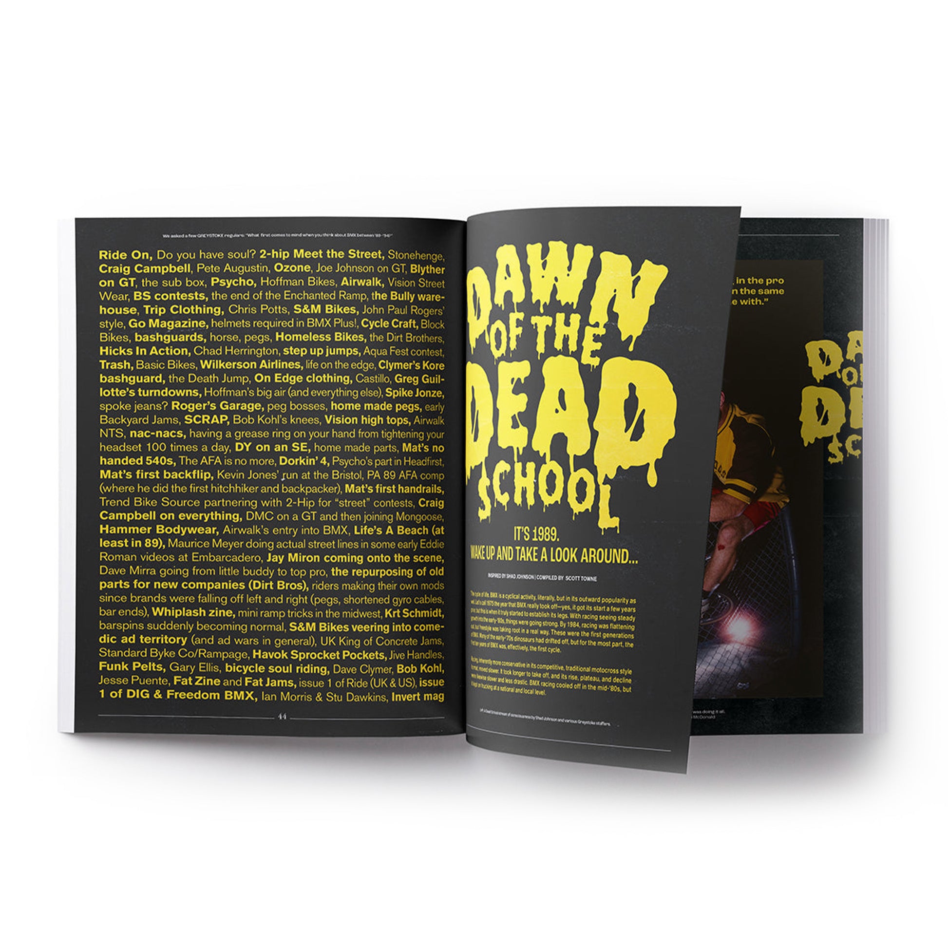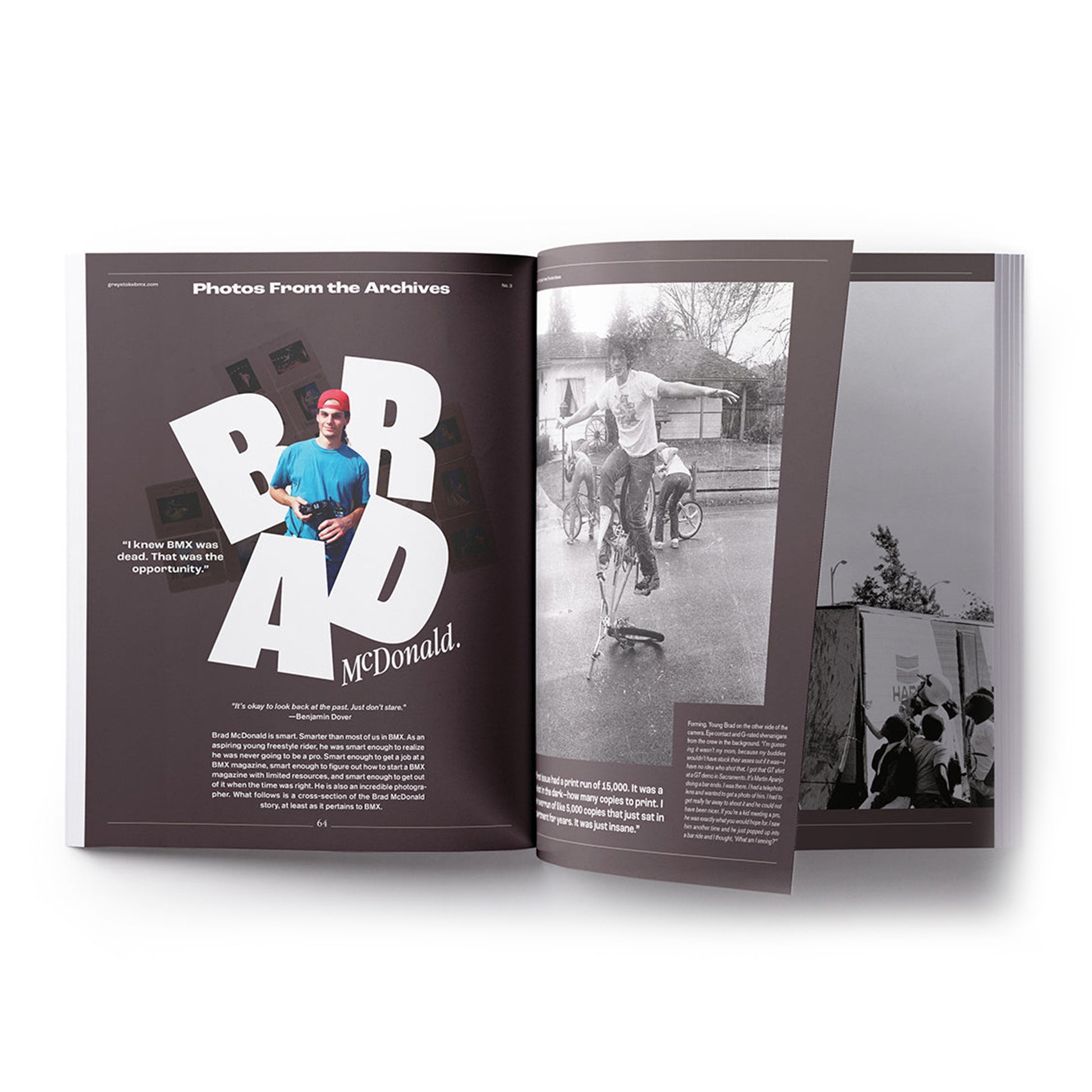 內容包含 Brad McDonald(布萊德・麥克唐納)的攝影專題、對傳奇騎士 Dave Voelker(戴夫・沃爾克)的專訪、珍稀的老款 BMX 車款、未曾公開的照片,並深入剖析在那個被稱為 BMX 沉寂的時代中,實際上仍然存在著怎樣的熱情與動能。